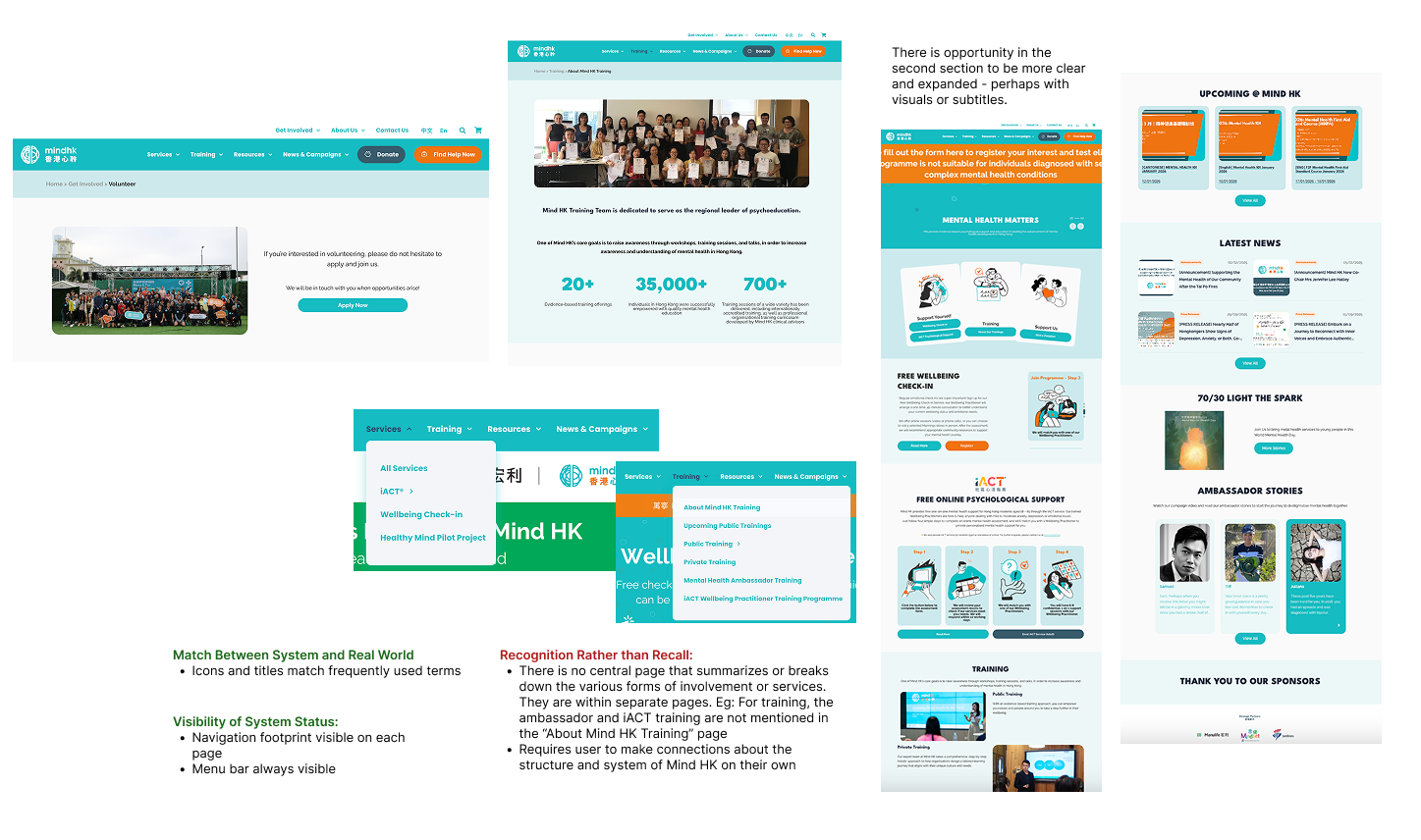 Since I was unable to interview Mind HK staff, I acknowledge the designs are focused on the needs of the potential and current volunteers and ambassadors. There was also an additional deliverable requested at this stage (a Donation page) which sidetracked my progress for this project. And so, to remain within the time constraints, I chose to keep my edits relatively simple and essential. While I wasn’t designing anything for internal usage, I still kept in mind what level of understanding users needed about Mind HK’s programs and system for the staff to manage them more effectively.
